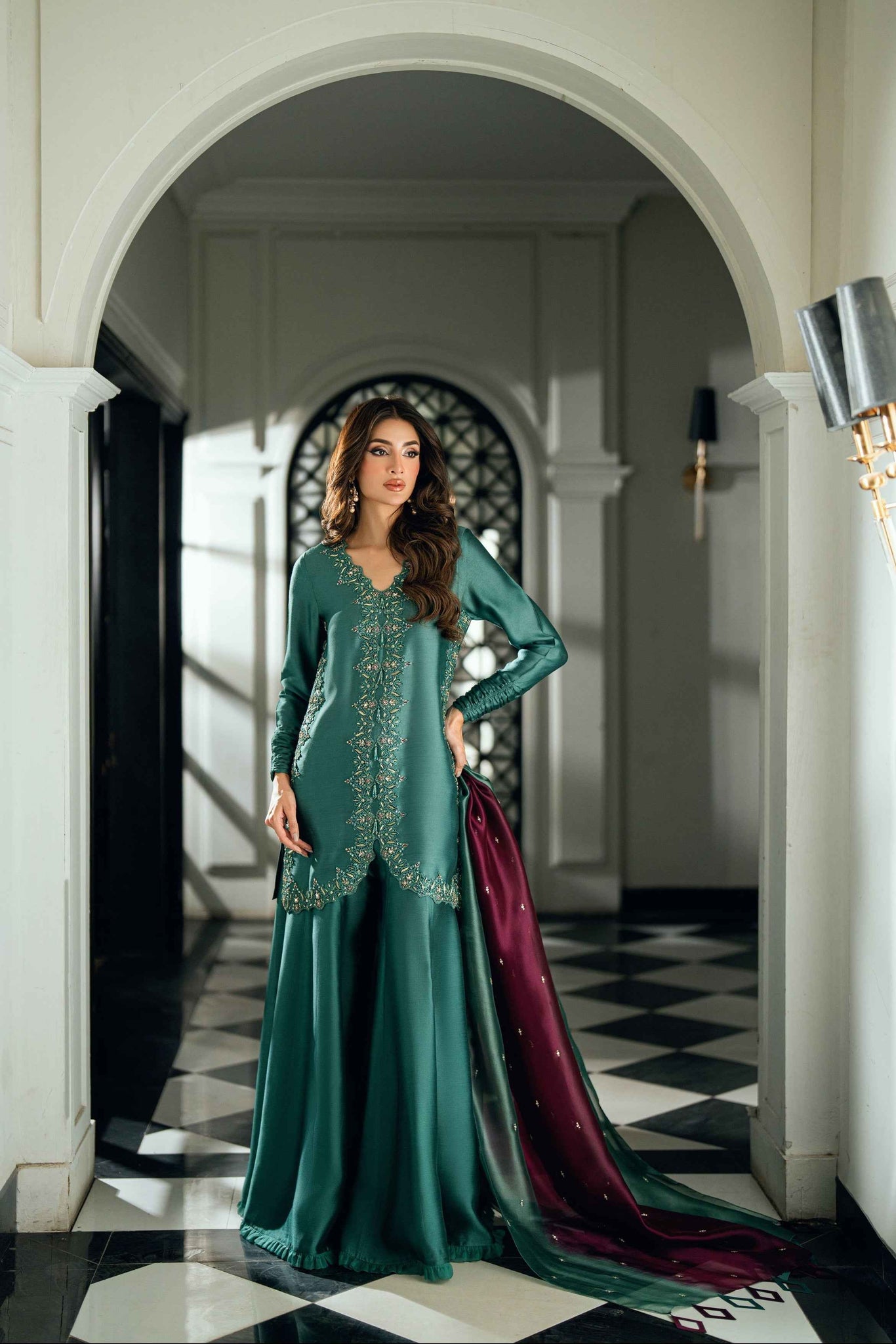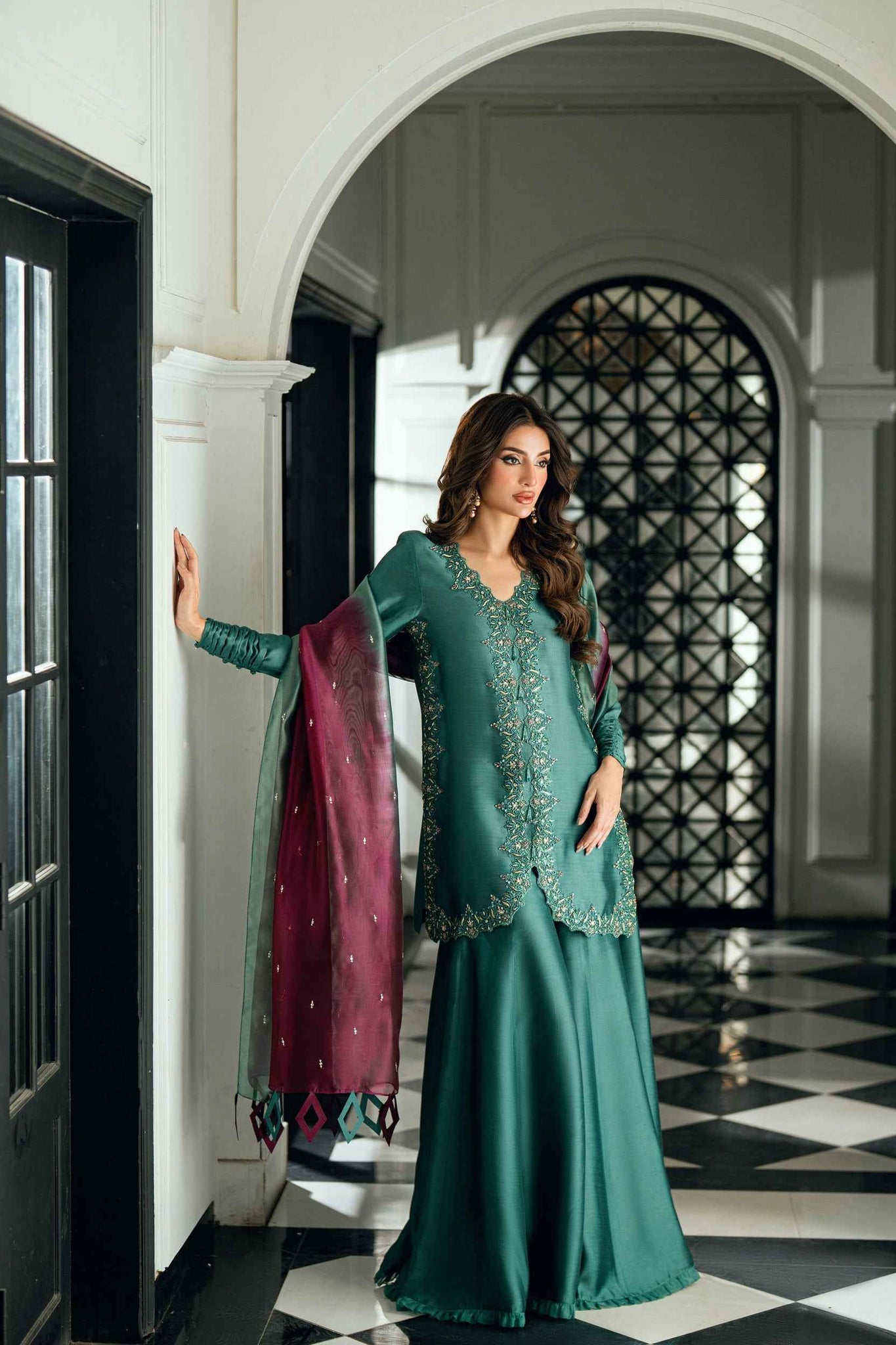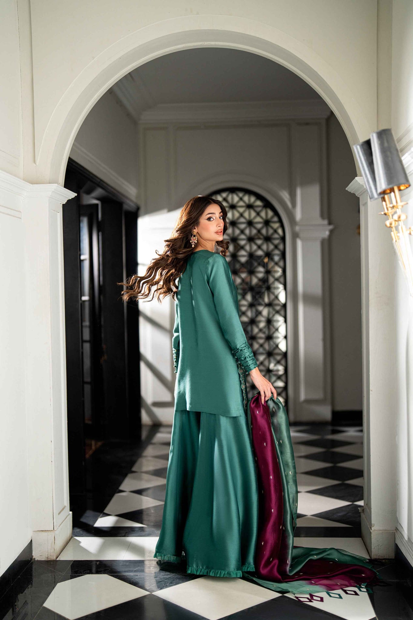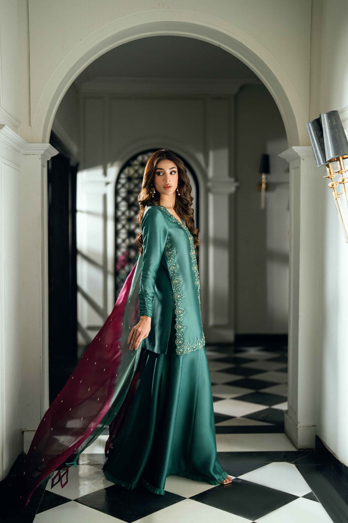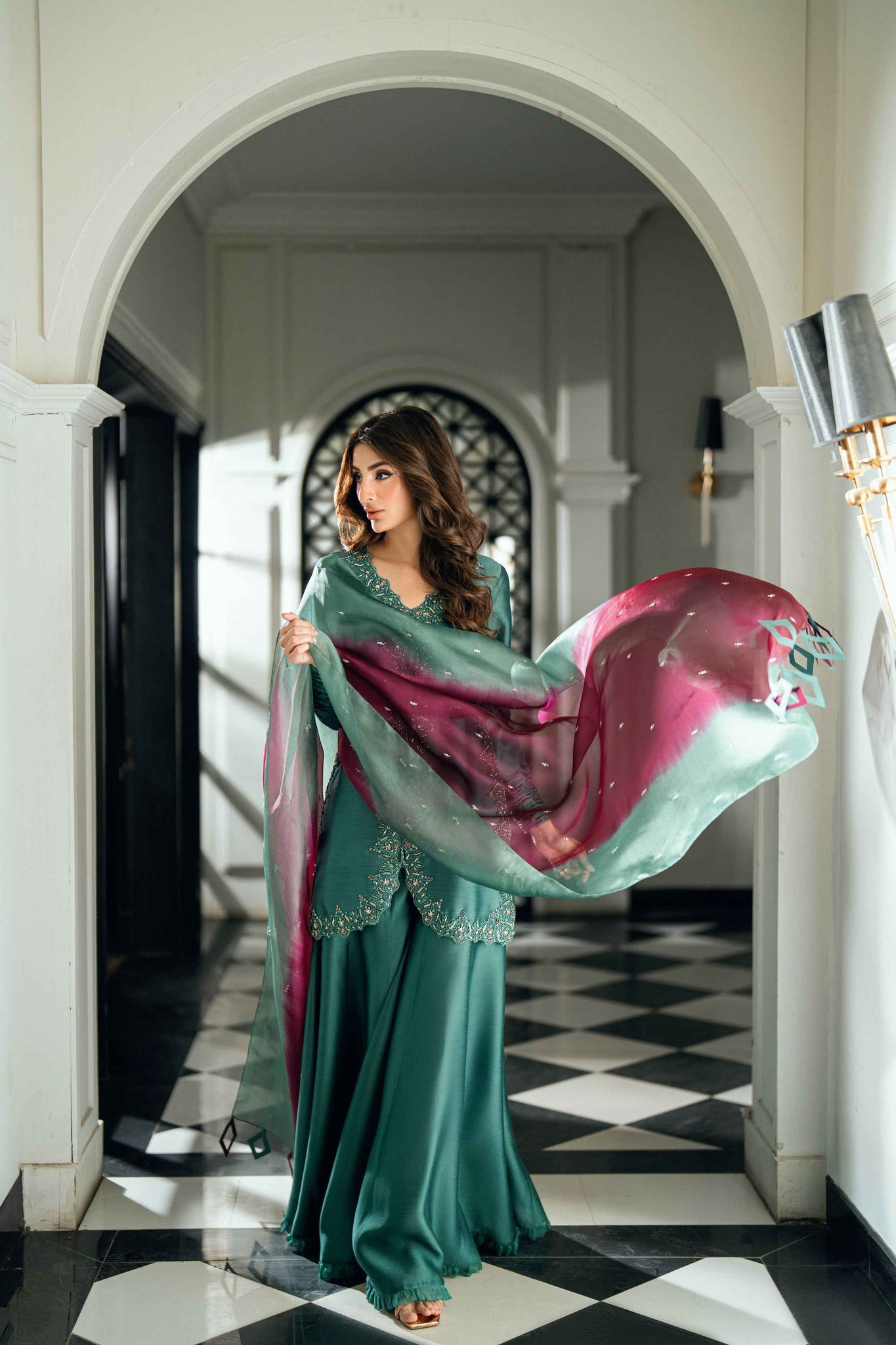 Details: Teal green front-open viscose silk shirt enriched with handwork on the front, paired with flared pants and a self-organza chan dupatta — timeless elegance in every detail.