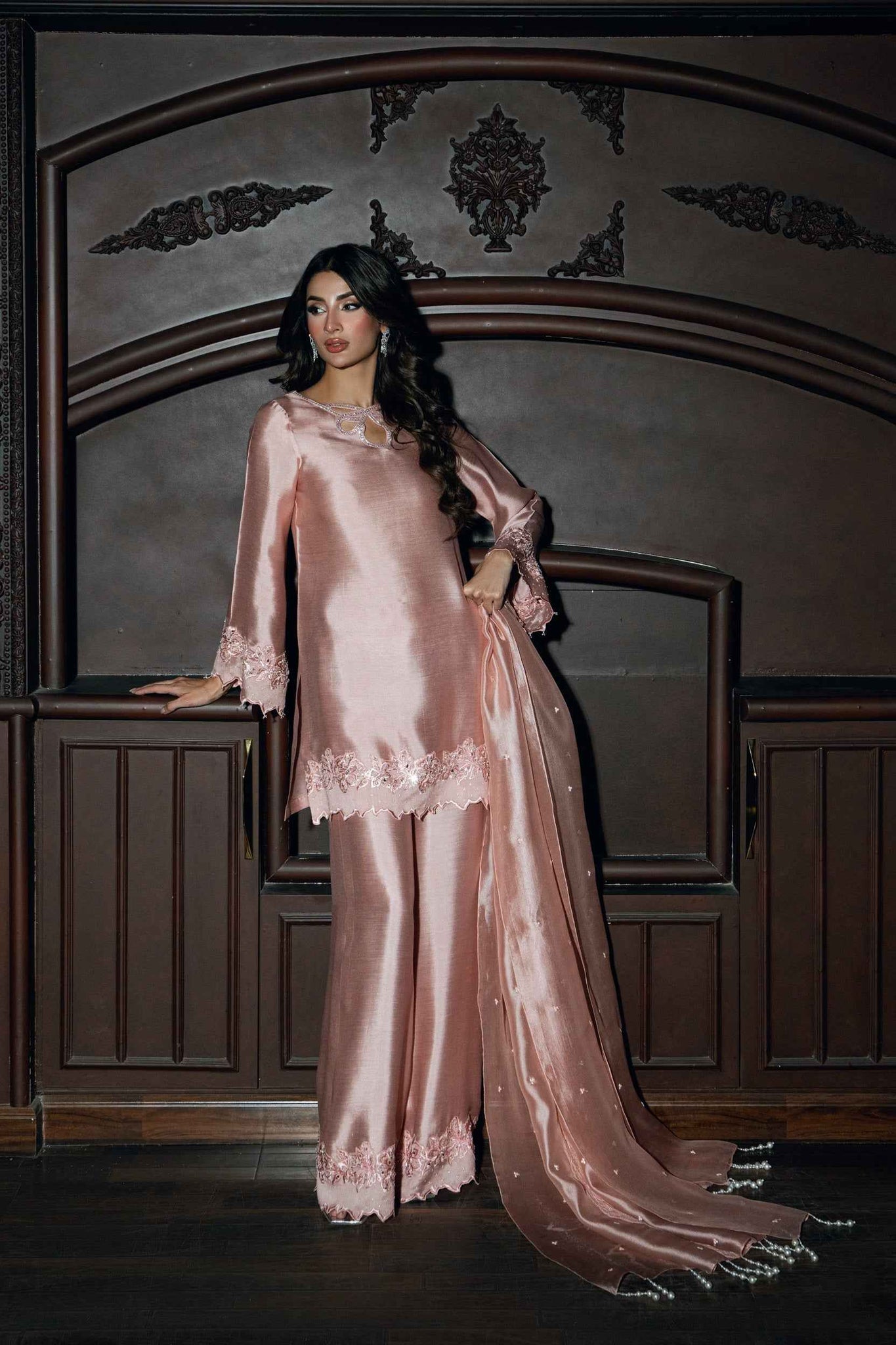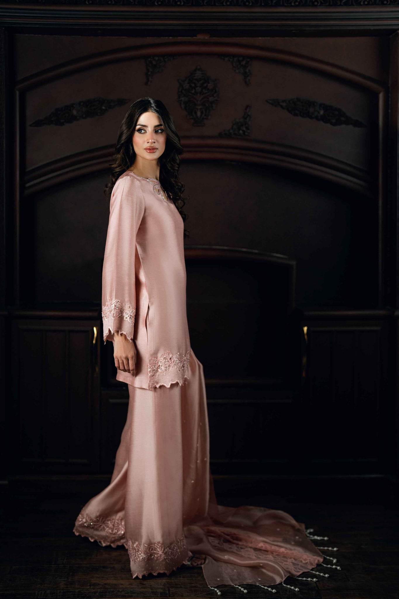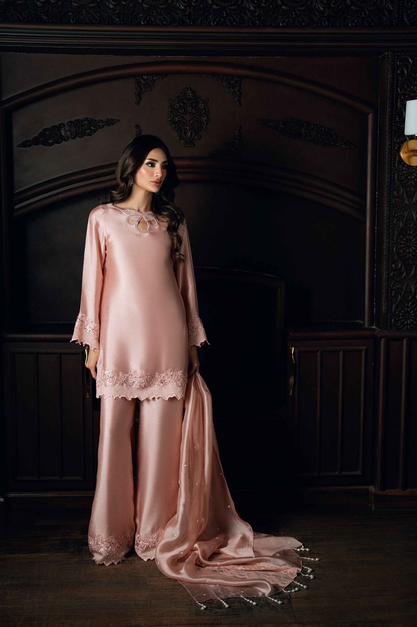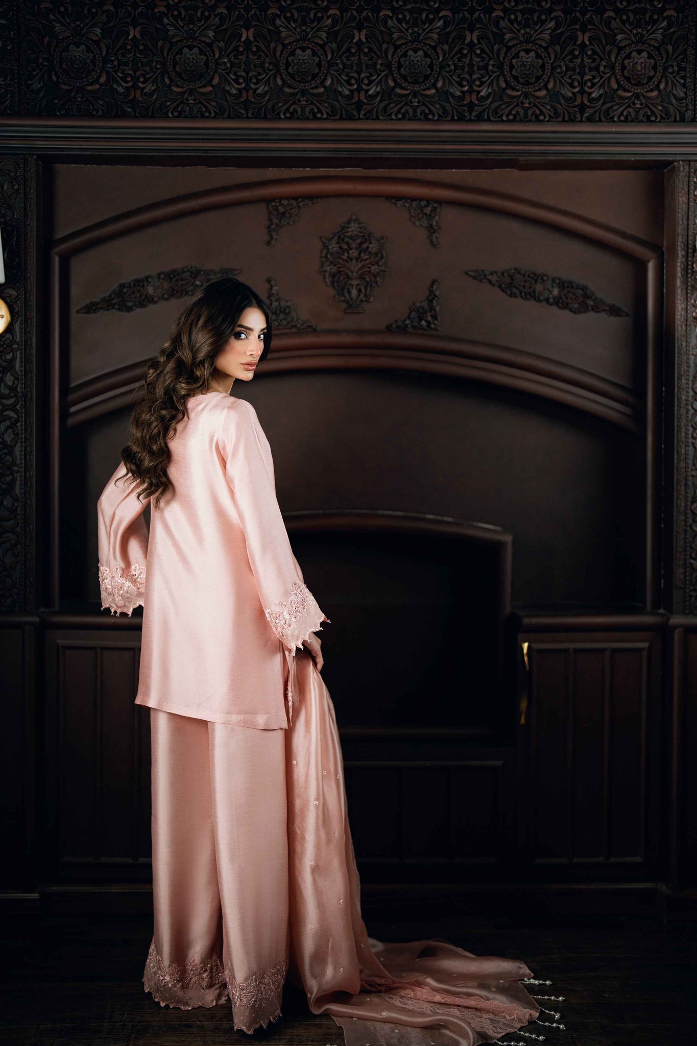 Details: A symphony of hand worked details, flowing silhouettes, and timeless pink hues. Viscose Silk shirt with embroidery and handwork details on the hem, sleeves and wide leg pants. Complete the look with a self-Organza and Chantilly lace dupatta finished with pearl tassels.
