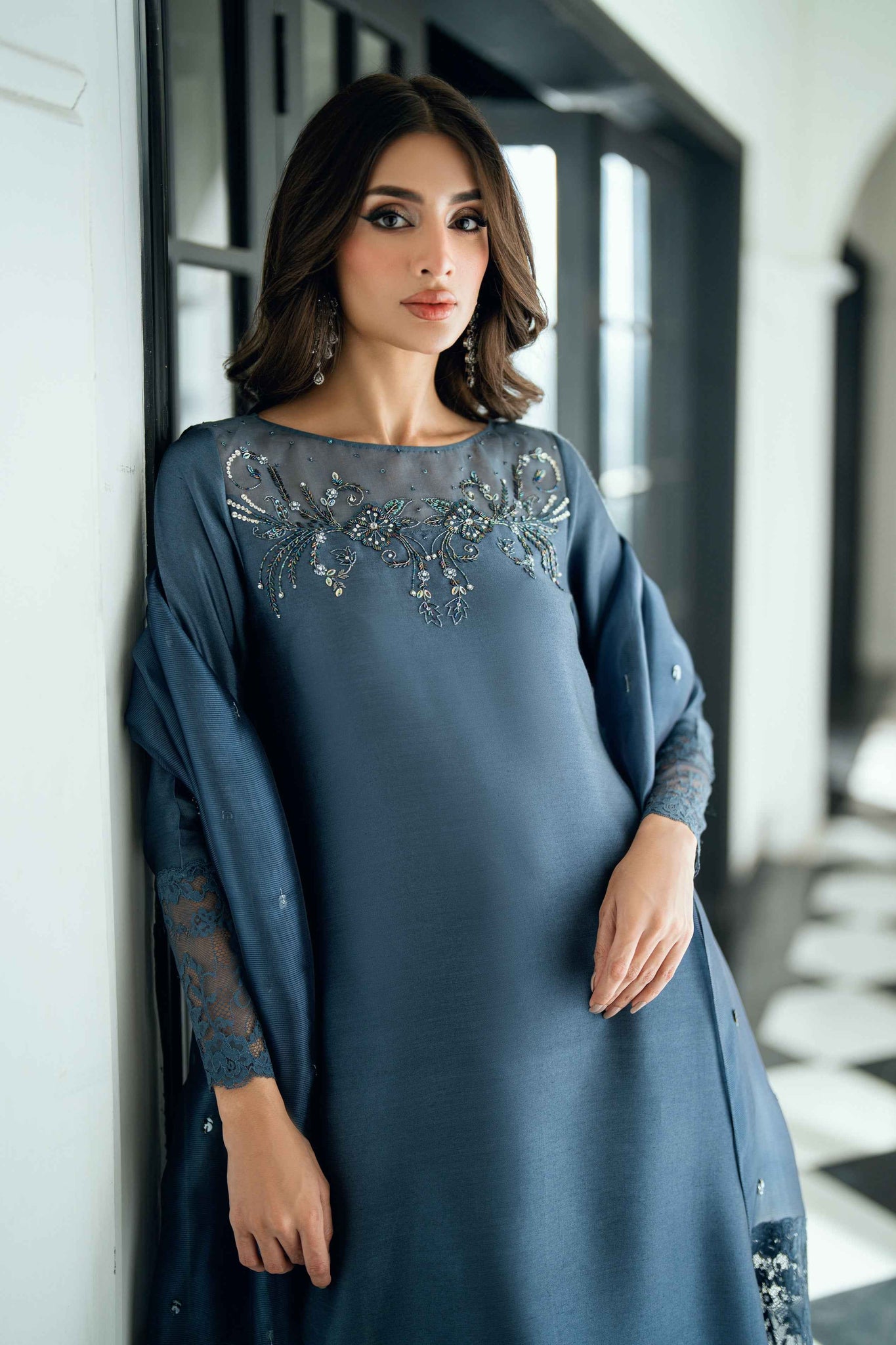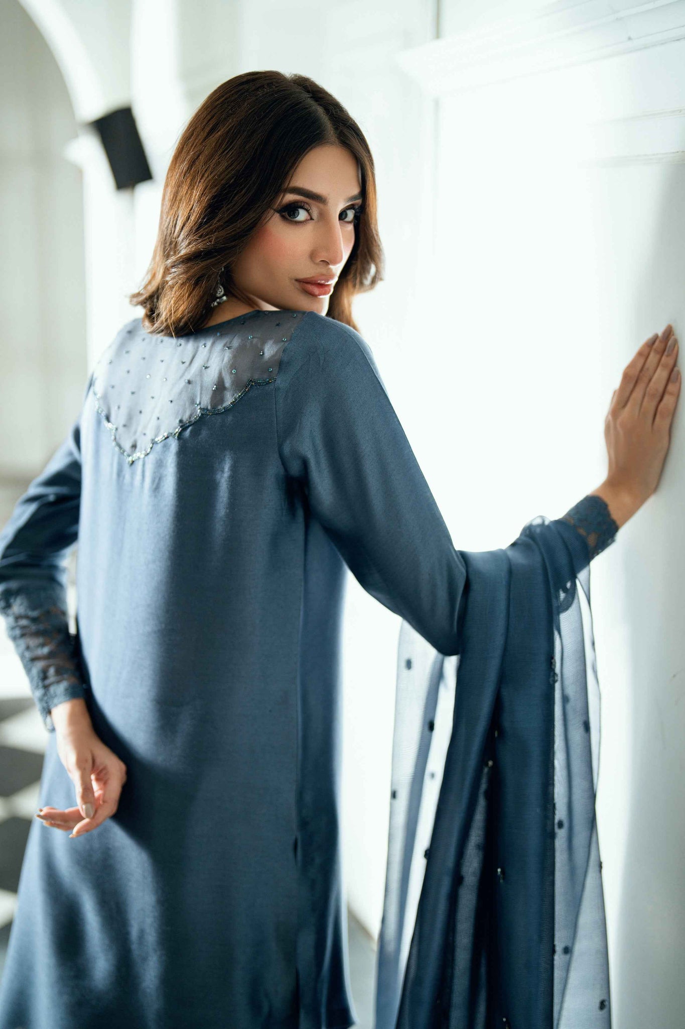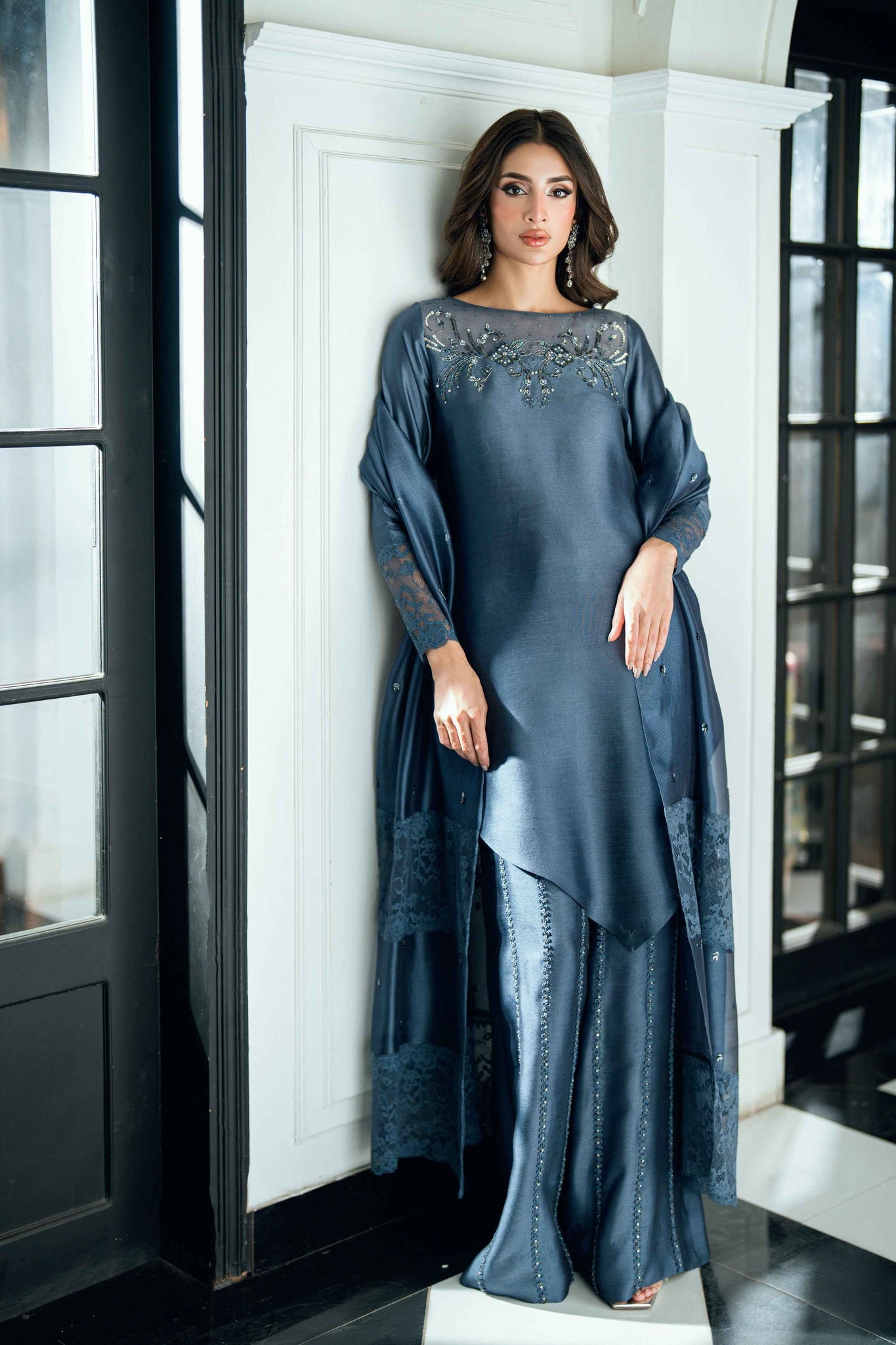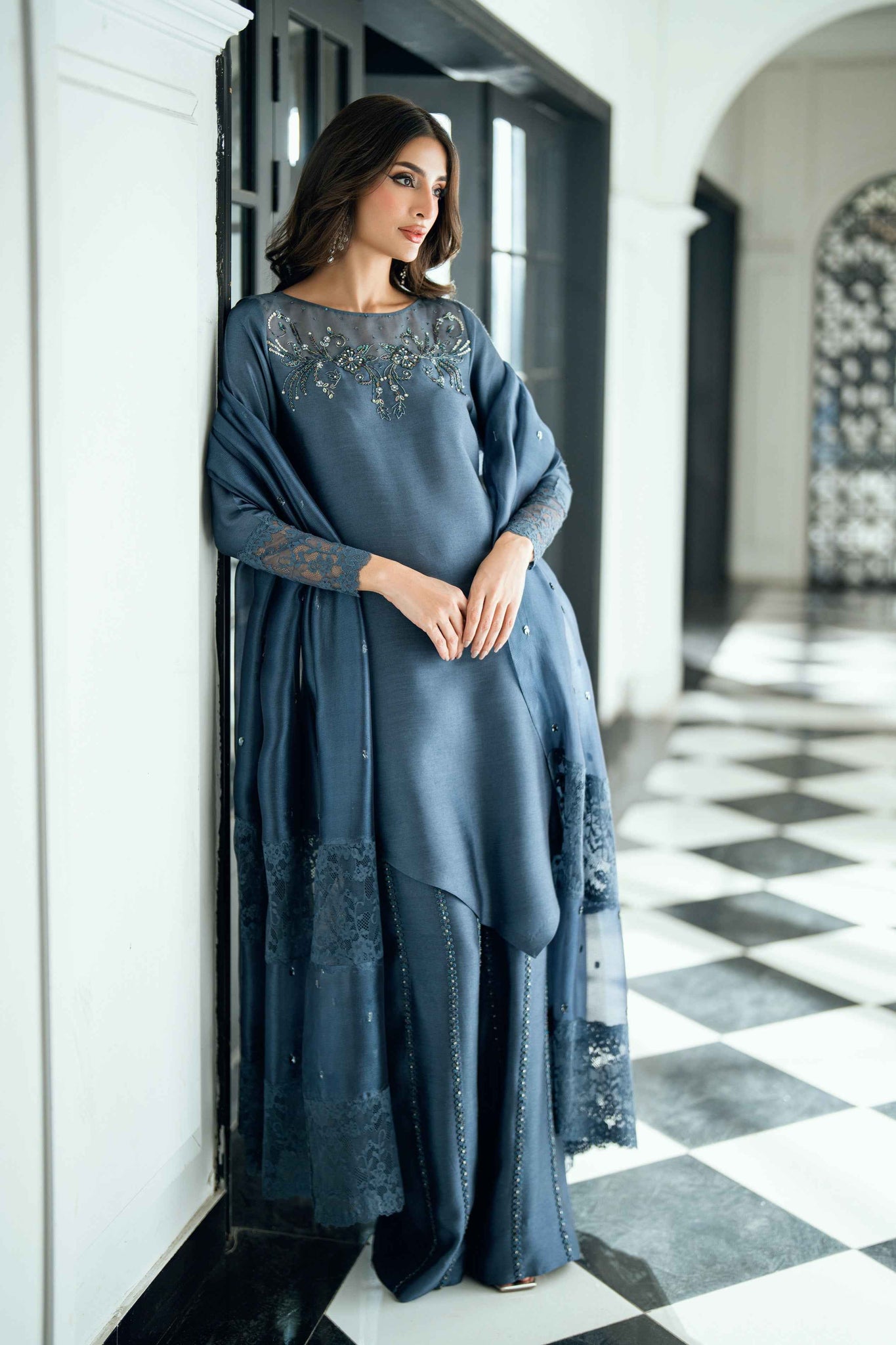 Details: A charcoal grey dream crafted in viscose silk, adorned with hand-worked details on shirt and pants. Pair it with a self-organza chan dupatta finished with diamond shaped tassels.