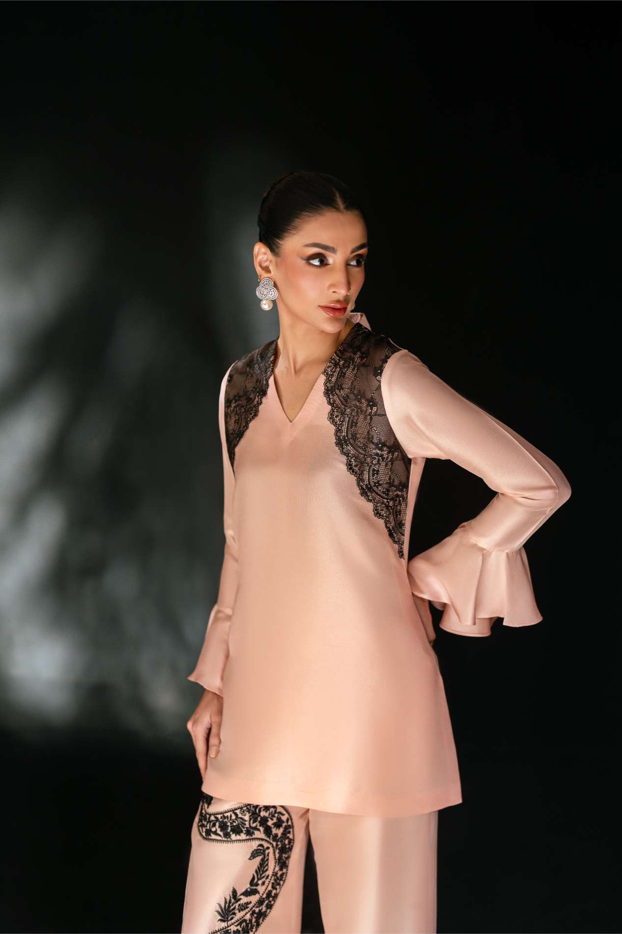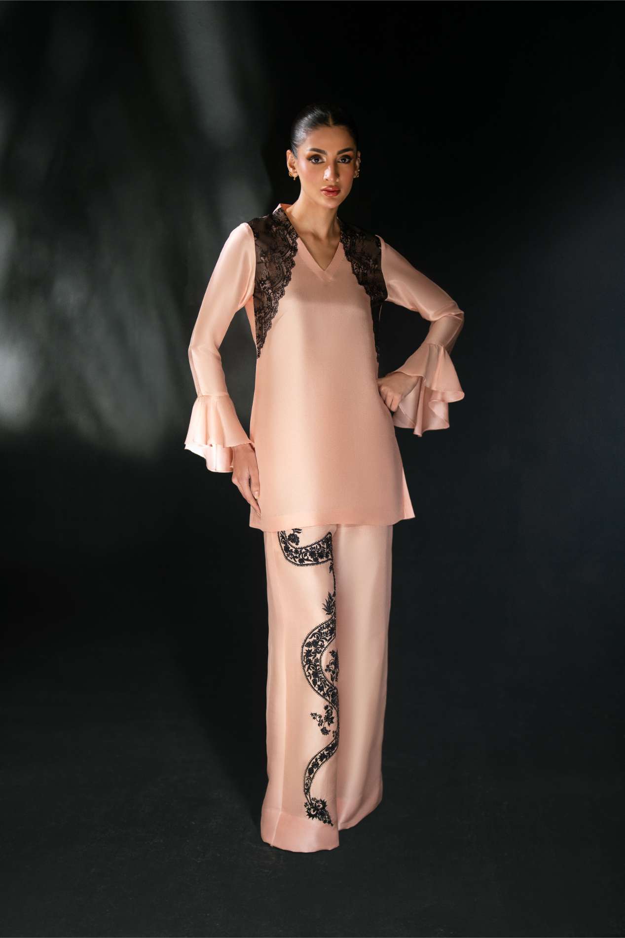 Details: A soft pink rawsilk shirt crafted in an elegant, fluid silhouette, enhanced with delicate Chantilly lace detailing for a refined contrast. The flounce sleeves add graceful movement and a touch of femininity. Paired with wide-leg pants adorned with an intricate black embroidered motif cascading along the side, this ensemble blends softness with statement artistry