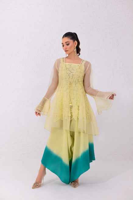 Details: This butter-yellow organza coat is a vision in light, detailed with a cutwork lace inner that adds depth and dimension. Paired with angled shaded pants, the whole look is soft yet structured — perfect for summer festivities or intimate events